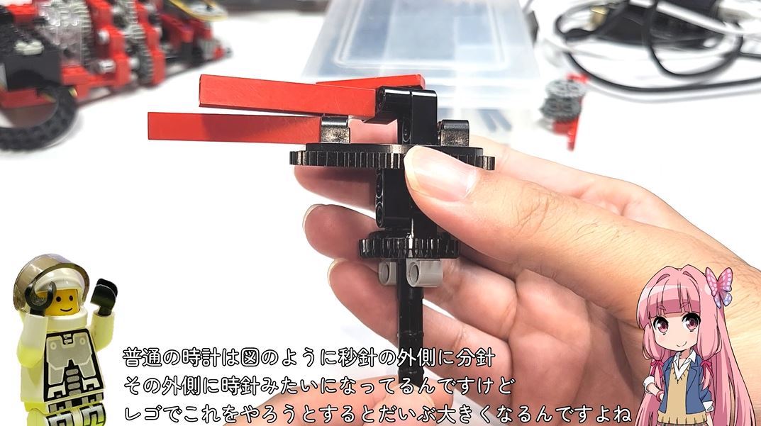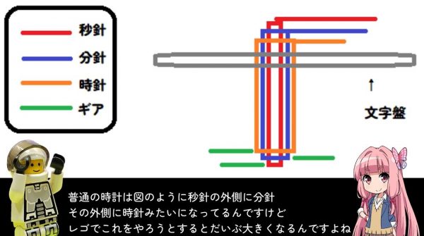 モーターとギアで3つの針の動きはできましたが、それぞれの針を見やすく配置する必要があります。普通の時計では図のように秒針の外側に分針、その外側に時針といった形になっているのですが、レゴでこれを実現するとかなり大きくなるのだとか。しかしあまりにも大きいと腕時計にするのは難しくなってしまいますね。