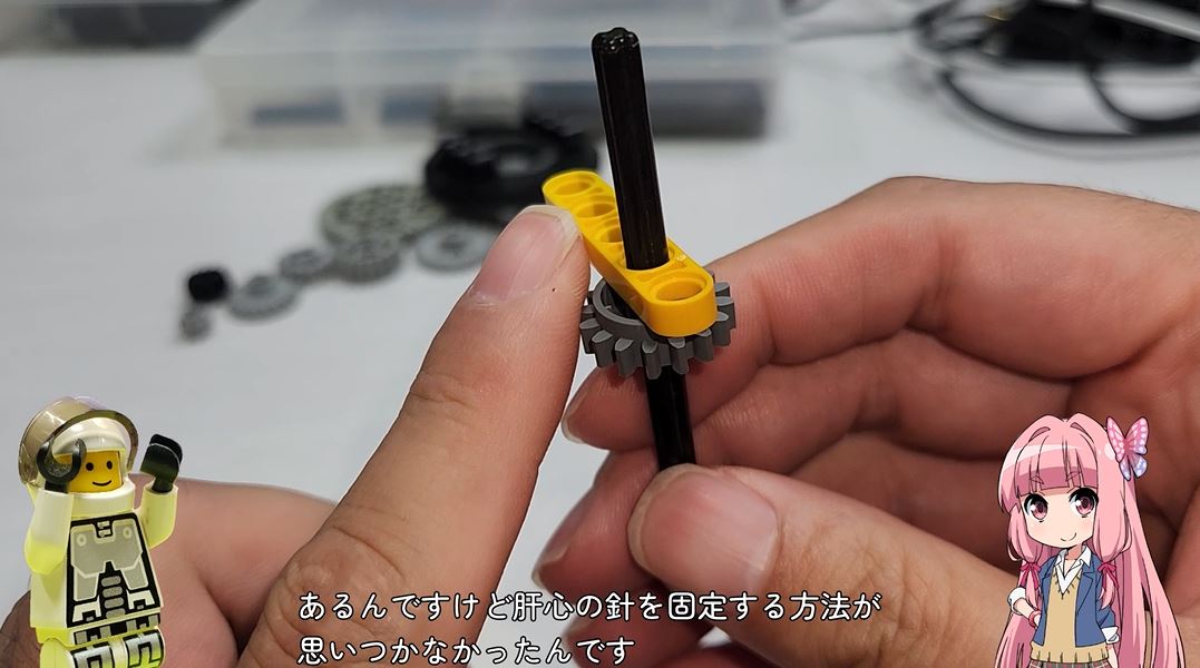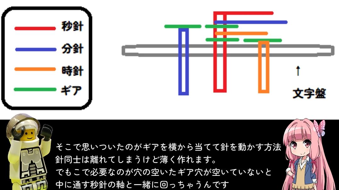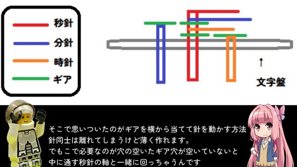 そこでやもブロックちゃんねるさんはギアを横から当てて針を動かすことにしました。動力から針は離れますが、これなら薄く作ることができます。