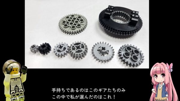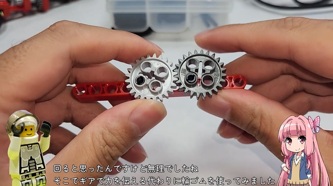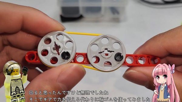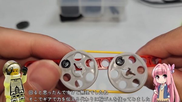 輪ゴムで力を伝えるならばギアである必要はありません。そこで理想に近い形のパーツを選択したやもブロックちゃんねるさん。