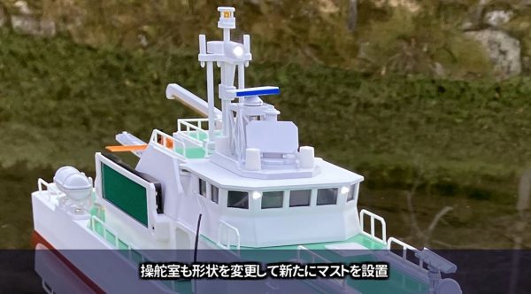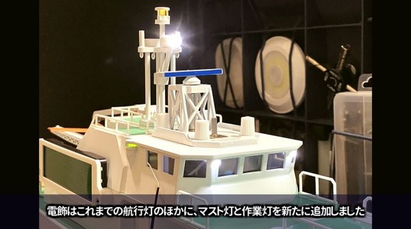 操舵室の形状を変更した際、新たにマストを設置してマスト灯と作業灯も追加しました。マストの上と操舵室の左右が光っていますね。ちなみに各種アンテナもクルクルと回転します。
