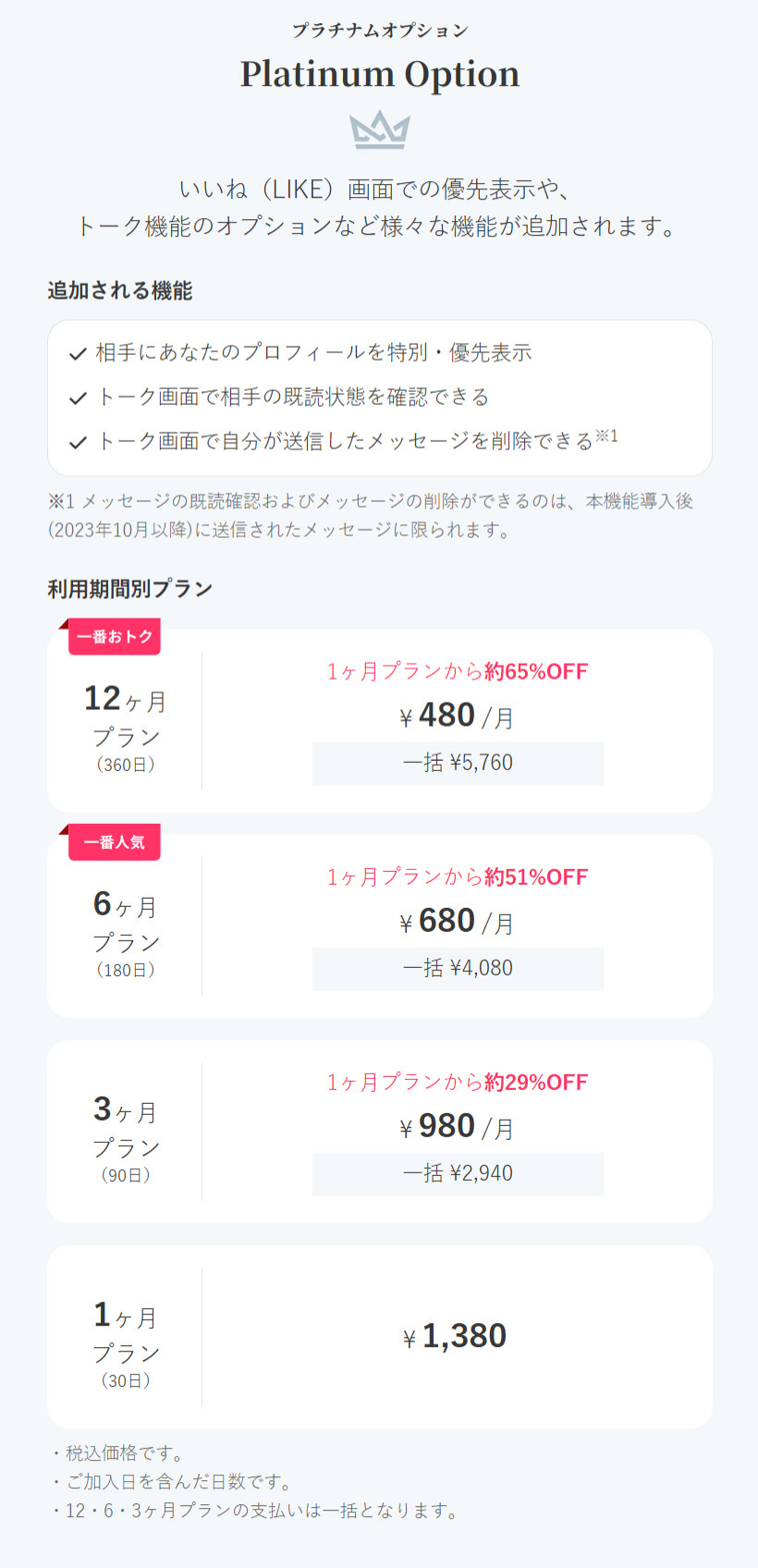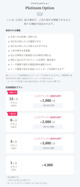Platinum Optionに加入すると1日に送れるいいね(LIKE)の数が30件に増えるので、マッチング率を上げたい方にはおすすめですね。