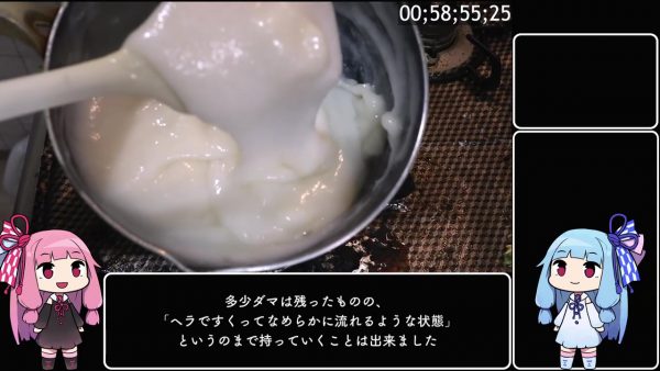 砂糖を加えれば何とかなるかもと期待するも歯が立たず、水を足して柔らかくします。多少ダマは残ったものの、レシピ通り「ヘラですくって滑らかに流れる状態」にすることができました。