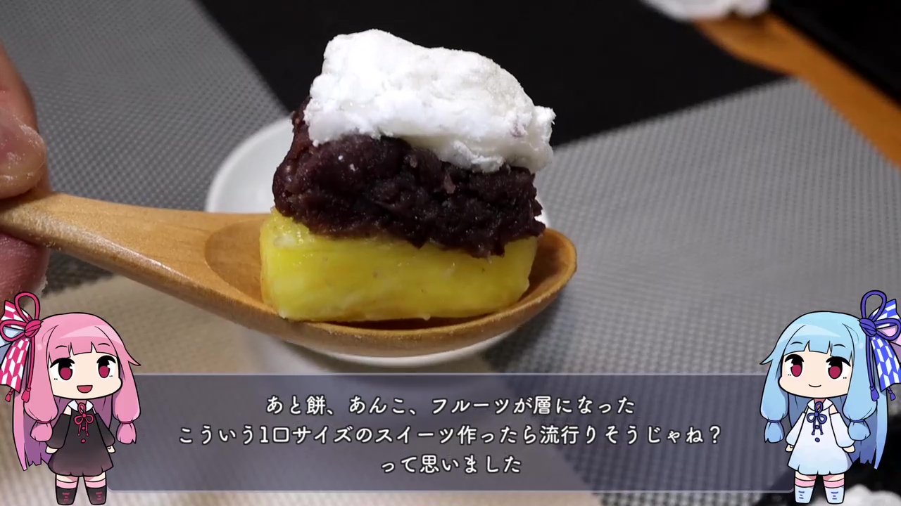 さらに「こういうスイーツ作ったら流行りそうじゃね?」とフルーツ・あんこ・餅を縦に積んだ盛り付けなども披露。ひとくちサイズで手軽に食べられますし、めっちゃうまいそうです。