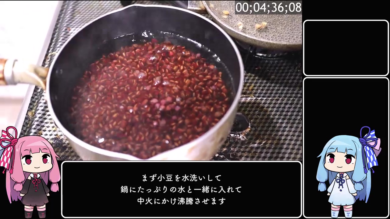 まずはつぶあん作り。小豆を水洗いし、たっぷりの水で沸騰させます。ここで「差し水を2回するって書いてたからやったけど、理由はよくわかりません」との本音がポロリ。投稿者は学校で小豆の炊き方も習い、学園祭でいちご大福を作った経験もあるそうです。