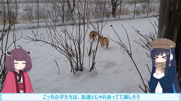 じゃれあって楽しそうに走り回っているキツネもいました。