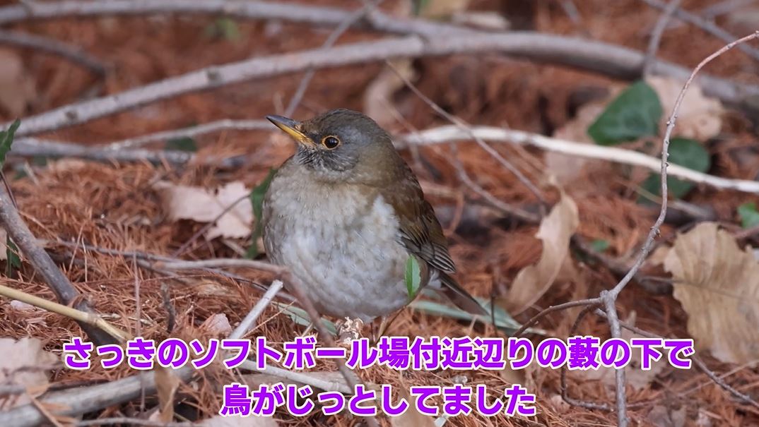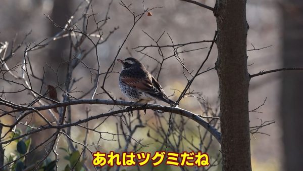 休耕田エリアを抜けて野鳥園へ向かう途中、少し大きな茶色の鳥がいました。ツグミです。先ほどのモズやホオジロは一年中見られる留鳥ですが、ツグミは秋から冬にやってくる冬鳥です。ロシアのシベリアから渡って来るのだとか。