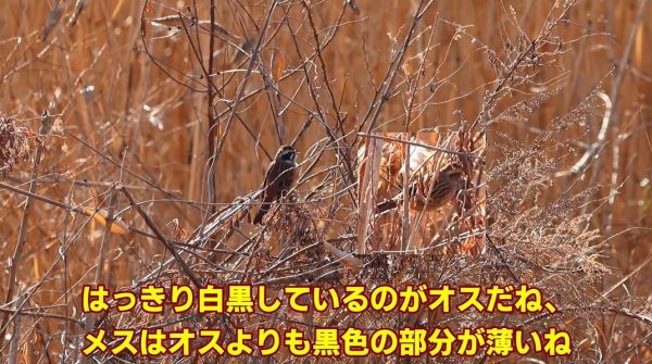 モズから少し進んだ場所で藪の中を動き回るホオジロと遭遇。白黒がはっきりしているので見つけたのはオスです。新米マスターさんにとって鳥の面白いところは、オスとメスで姿が全く違うものもいれば、地味な違いしかない種類もいるところだそう。