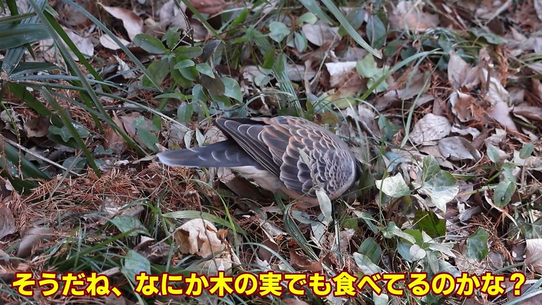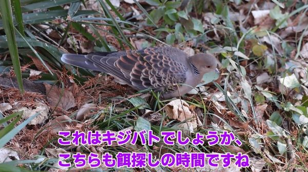 野鳥園でまず見つけたのはキジバト。地面に頭を突っ込んでエサ探し中です。