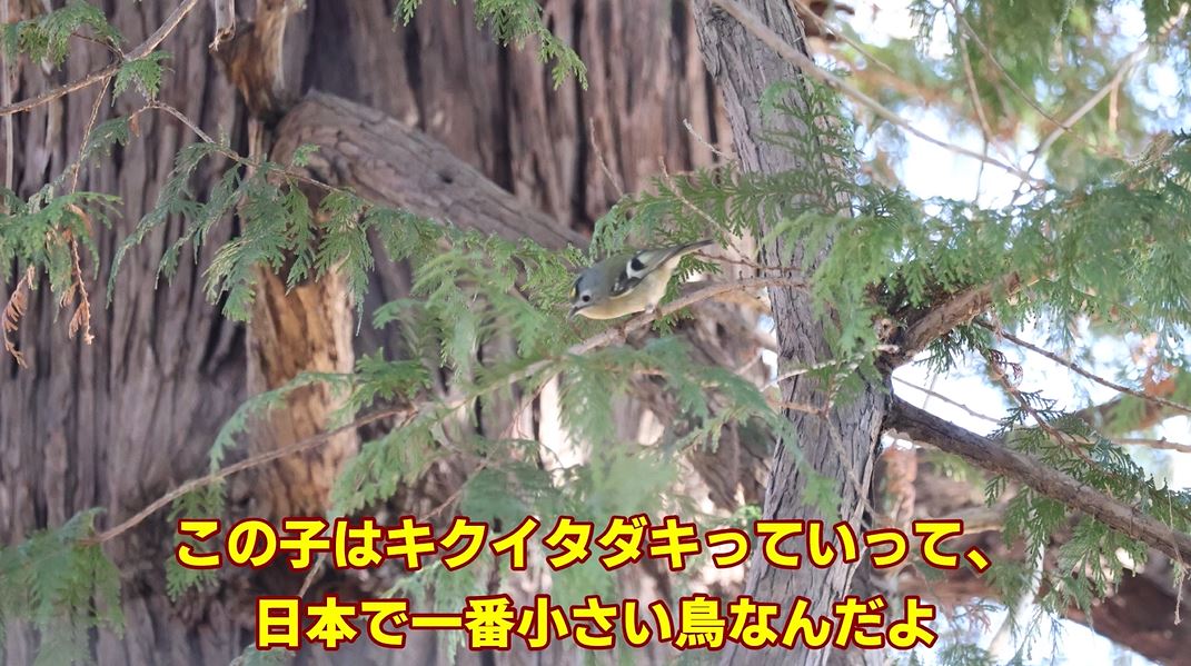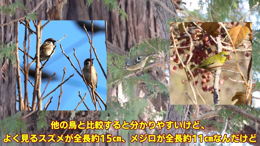 スズメが全長約15㎝メジロ全長約11cmに対し、キクイタダキは約10㎝。この小ささでエサになる松の木の間を飛び回るので、撮影が難しい鳥なのだそうです。