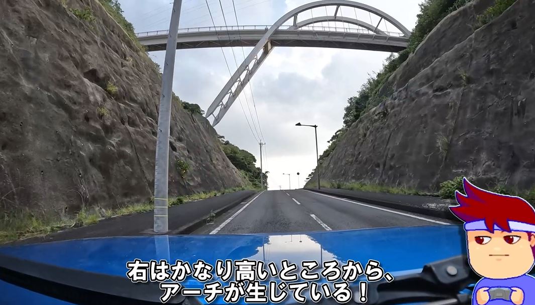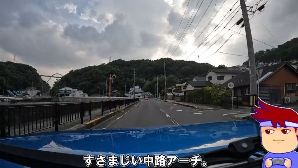 「なんだあの橋?」のあと「すさまじい中路アーチ」と表現したのは、左手に見える山の間の橋のこと。