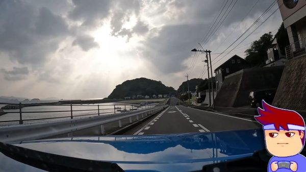 あの景色は何だったのでしょう、という思いを抱いたまま海沿いの道へ。雲から射しこむ日の光がとても綺麗な情景が広がります。