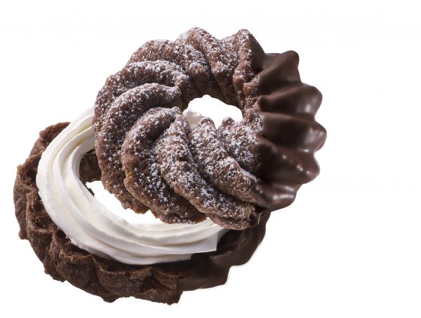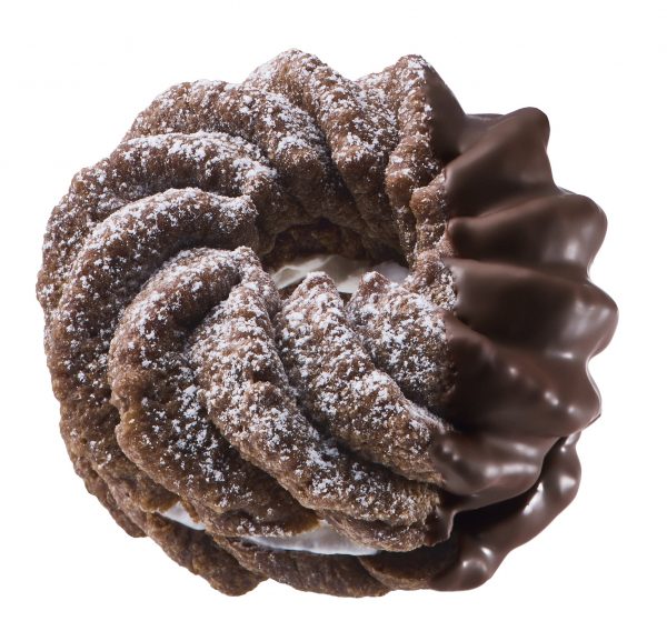 ミルクチョコ風味のふわっと軽いショコラフレンチ生地に、ザクザク食感がアクセントのチョコクリームをサンド。仕上げにホワイトチョコをコーティングしました。