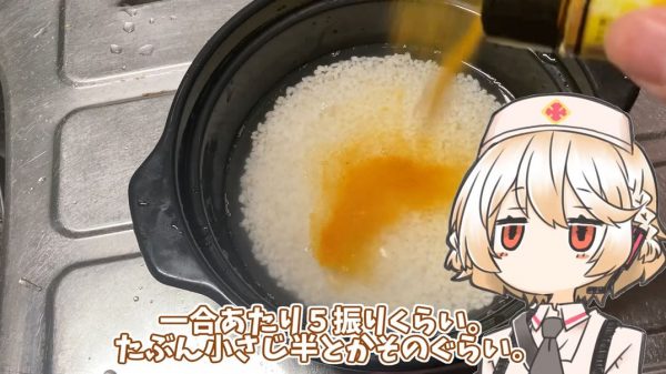 まずはターメリックライスを準備。あらかじめ浸水させたお米にターメリックを1合あたり5振りほど加えて炊きます。