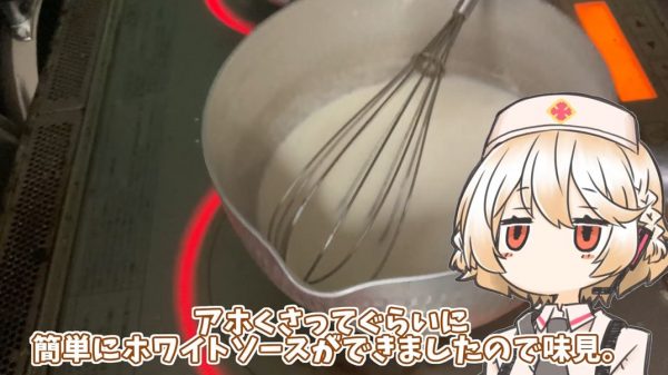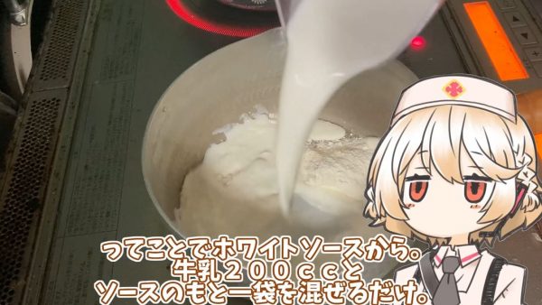 ホワイトソースは、牛乳200㏄とソースの素1袋を混ぜるだけで出来上がり。