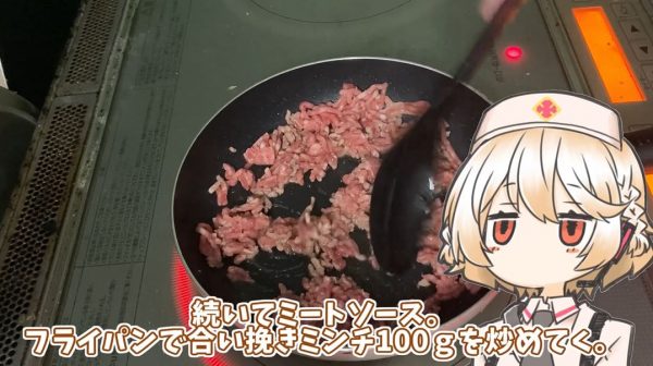 ミートソースはフライパンで合い挽きミンチ100gを炒めて作ります。サイゼリヤのものは牛ミンチなのですが、再現度を上げるための選択のようです。