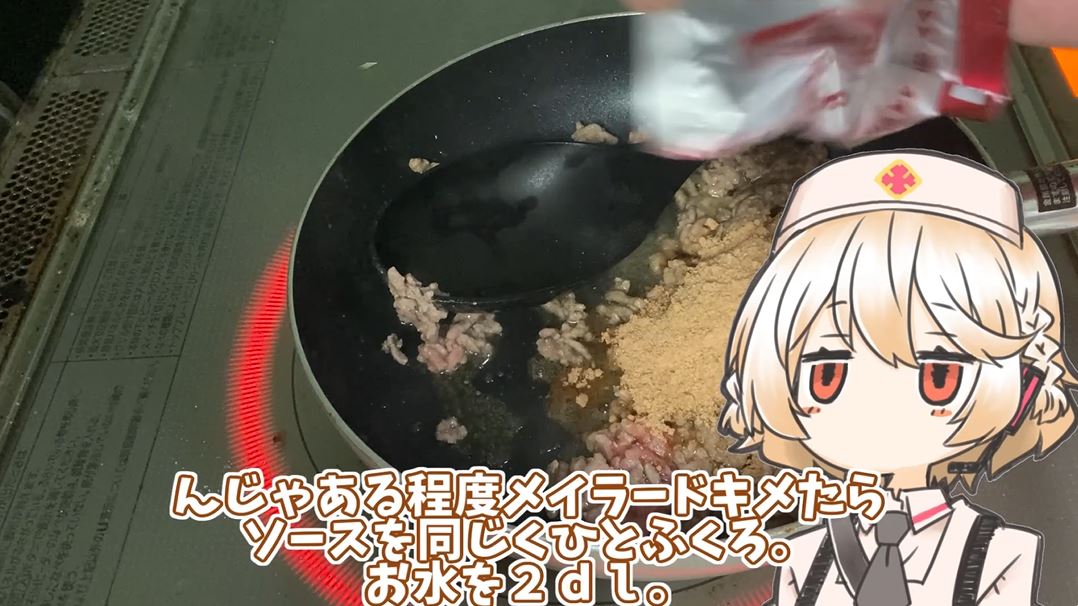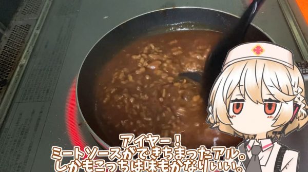 こんがりとメイラード反応が起きるまで炒めたら、ソース1袋とお水を200㏄投入。これで懐かし味のミートソースが出来上がりました。シンプルですが味はかなりいいとのこと。