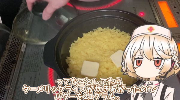 炊き上がったターメリックライスにはバターを21gを混ぜ込みます。