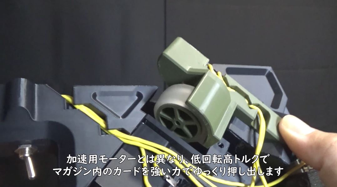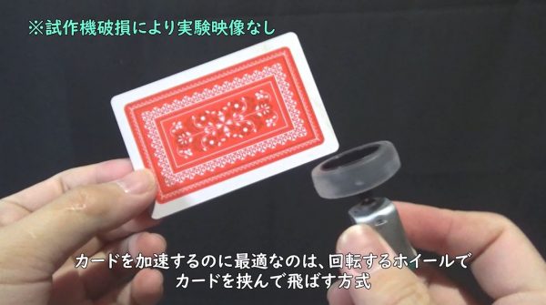 試作でわかったのが、カードを加速するには回転するホイールでカードで挟んで飛ばす方式のが最適ということ。
