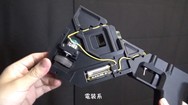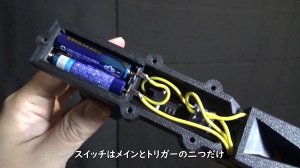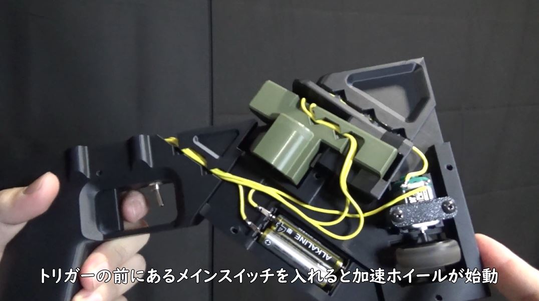 電装系はシンプルでスイッチはメインとトリガーの2つだけ。トリガーの前にあるメインスイッチを入れると加速ホイールが始動します。