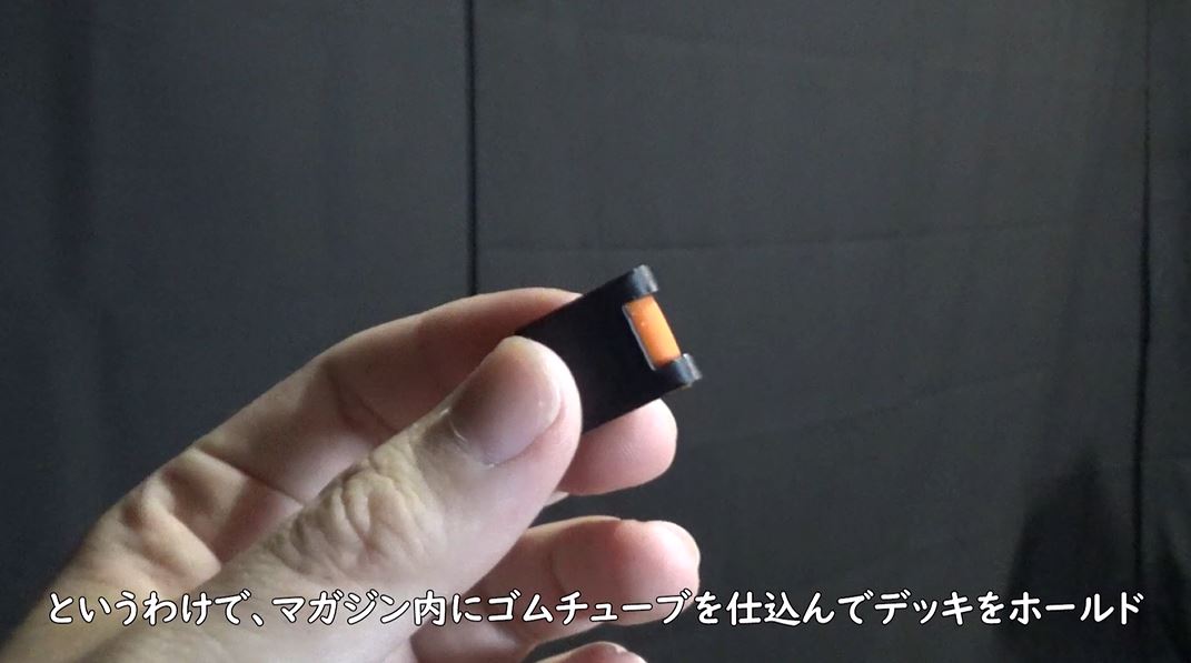 デッキ側面を柔らかいもので押さえると摩擦が分散してカードを1枚ずつ取り出せるので、マガジン内にはゴムチューブを仕込みました。