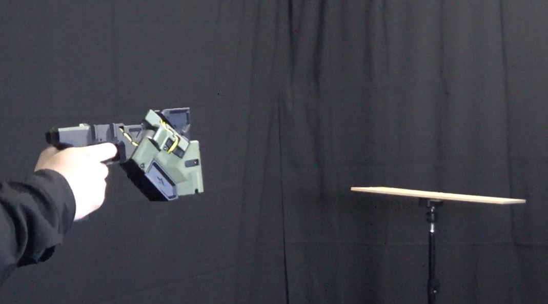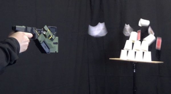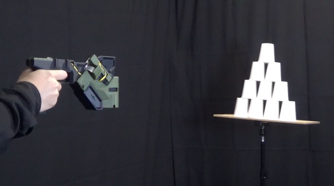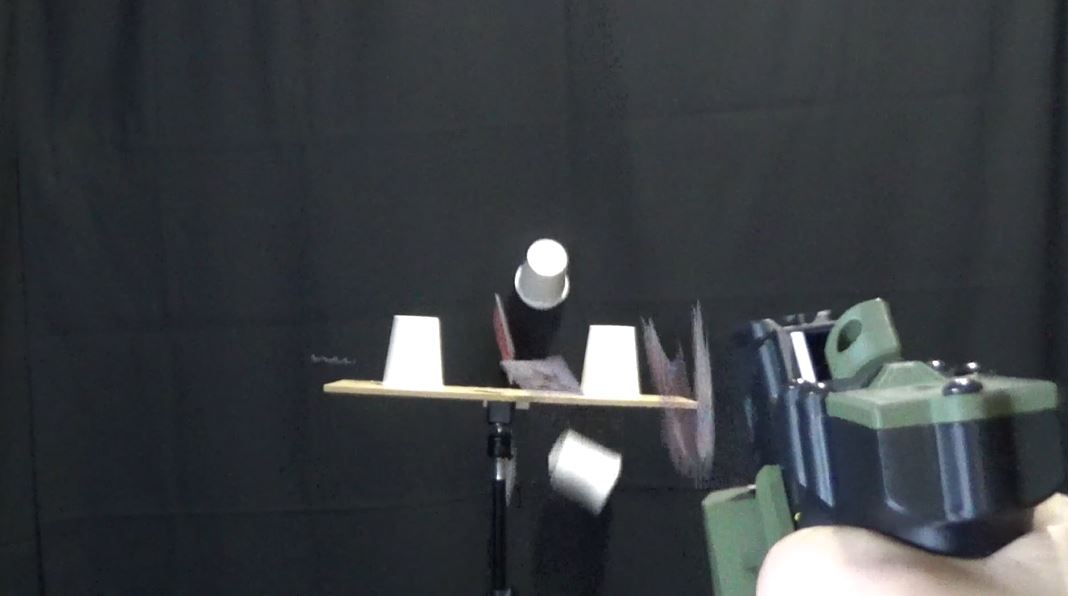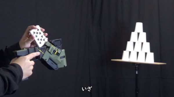 カードを束で装填したら、積み上げた紙コップの的に狙いを定めます。