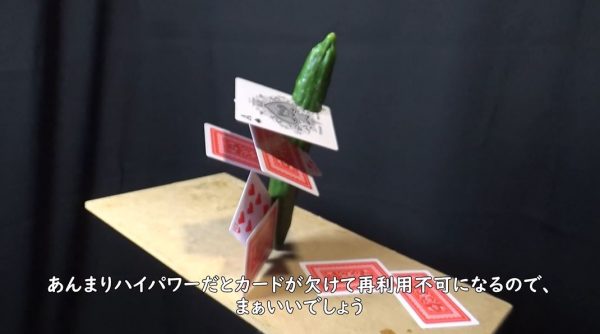 1枚ずつ、しかし連続して飛び出したカードが紙コップの山をみるみる崩していきます。