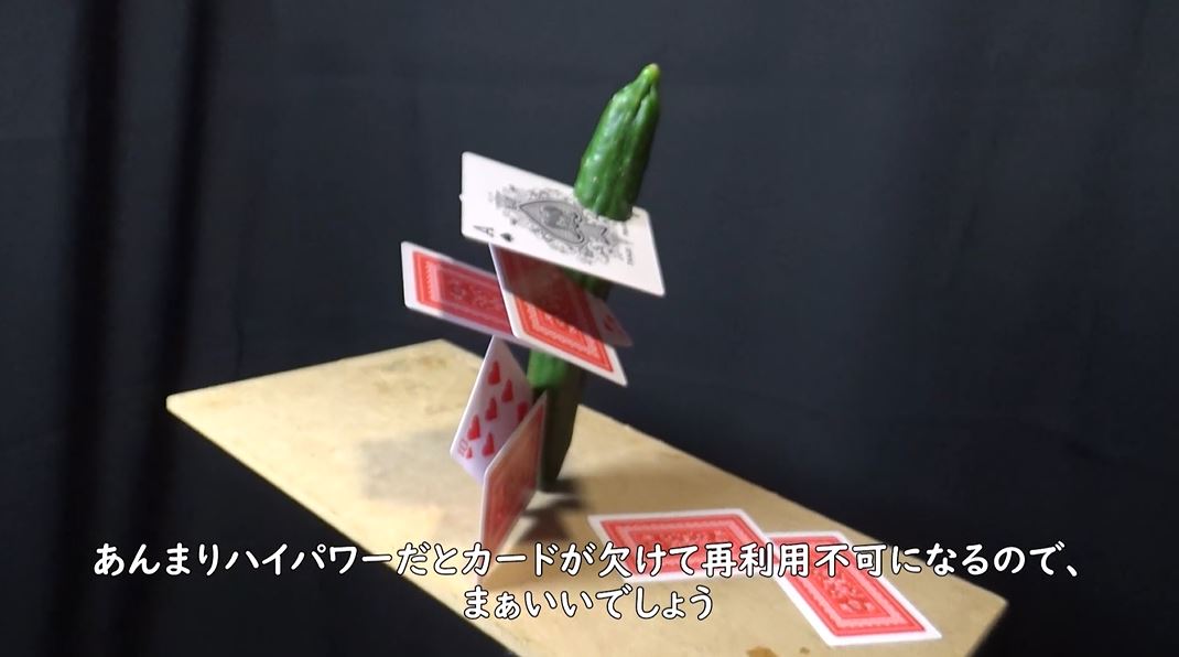 縦と横の両方で狙ったキュウリにはいくつものカードが刺さっています。しっかり刺さりながらもカットしないという絶妙な威力が感じられますね。