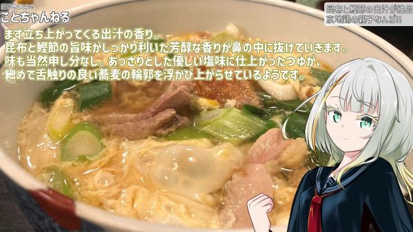昆布と鰹節の旨味が効いた豊潤な出汁の香りが立ち上ってくるのは「京地鶏の親子なんば」。地鶏と葱と蕎麦というそれぞれ個性あふれる風味を、卵がふんわりと美味しくまとめ上げているのだとか。長く丁寧な食レポ「ことレポ」の詳細に興味を持たれた方はぜひ動画ををご覧ください。