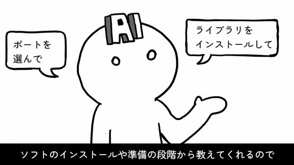 また、投稿者はプログラム作りの知識がないとのことで、ソースコードはAIに任せて自動生成することに。とりあえず「動けばヨシ」の精神で製作します。「自分は初心者」だとAIに伝えると、動作確認用のプログラムはもちろん、ソフトのインストールや準備の段階からていねいに教えてくれました。とても便利です。