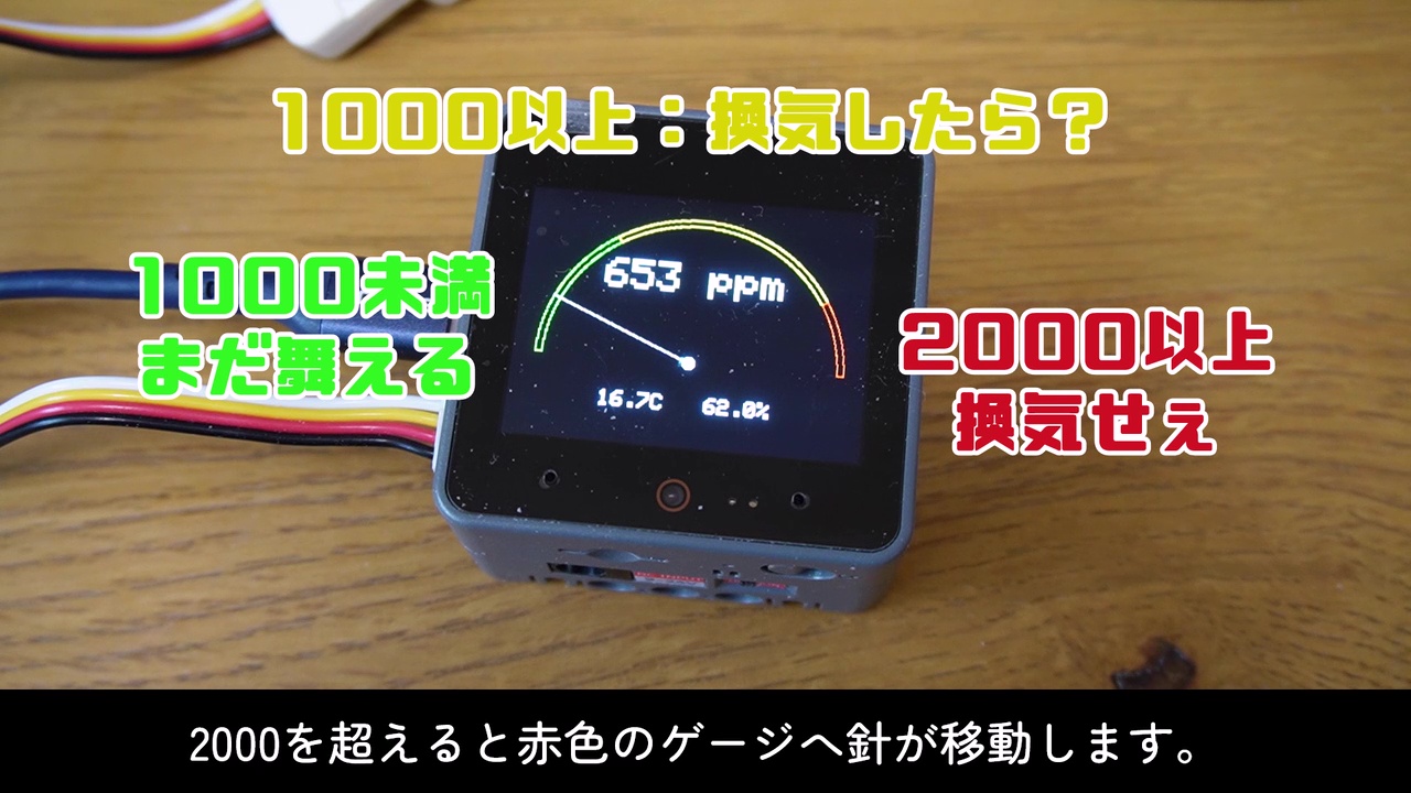最終的に完成したのは、CO2量に応じてメーターが値を指し示すようにした画面です。色分けもされており、問題ないときは緑、注意が必要なときは黄色、換気を促したいときは赤といった具合に、色でパッと把握できるようになっています。ケースも自作し、配線をきれいに収めました。