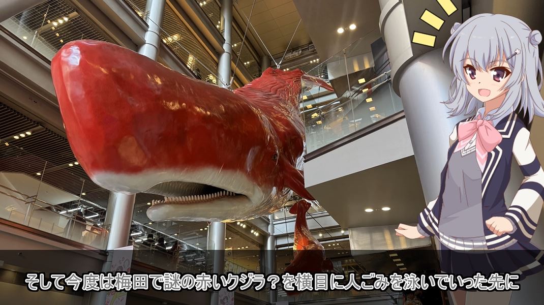続いてそるとさんは梅田へ移動。商業施設「HEP FIVE」にある石井竜也氏デザインの赤いクジラを横目に人ごみを泳いでいきます。