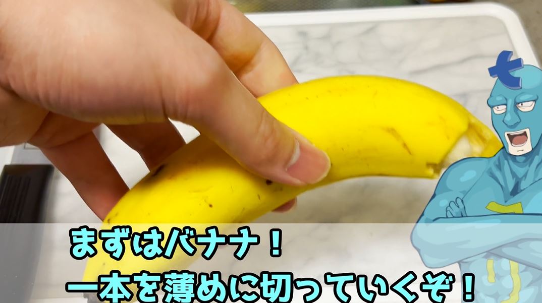 まずはバナナを薄めにカットします。画像には1本とありますが、使うのは半分でいいとのこと。