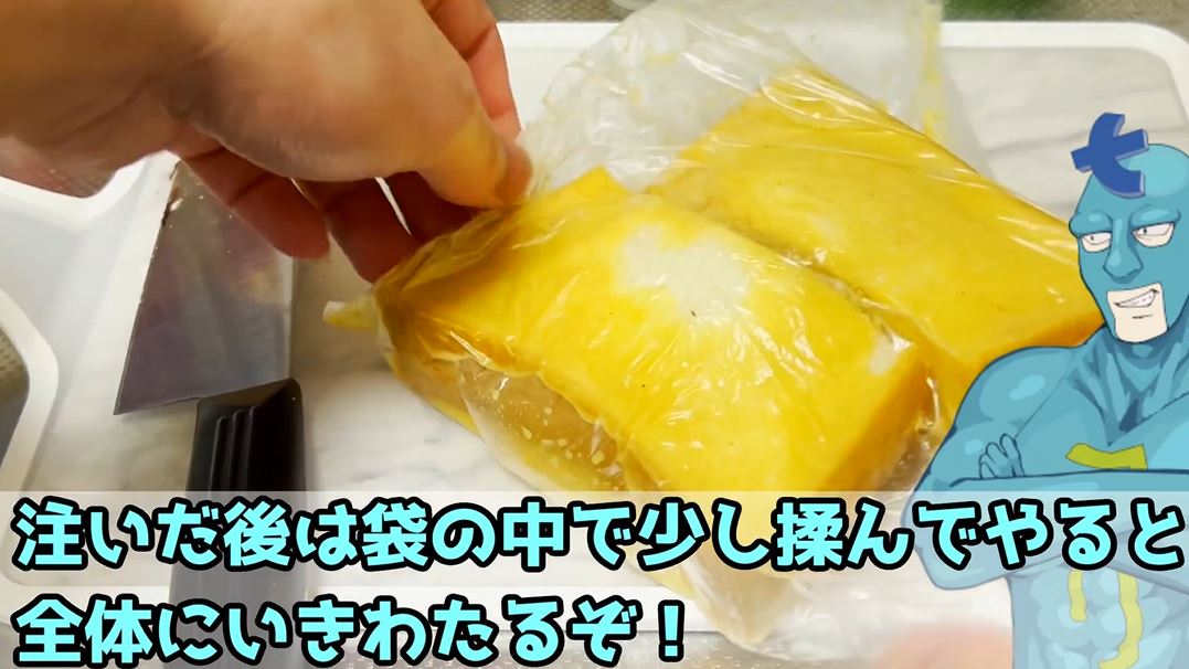 プリン液を1分半レンジで加熱したら、パンを入れた袋に加えます。袋の中で少し揉むと全体に行き渡るとのこと。