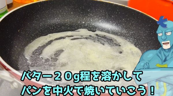 5分ほど置いたら、バター20gを溶かしてパンを中火で焼いていきます。