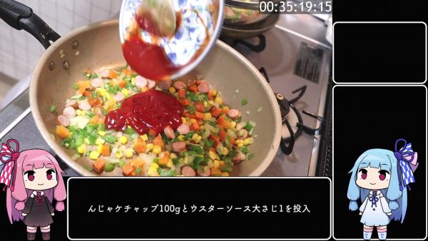 フライパンでソーセージを炒めて、こんがりしてきたら野菜(玉ねぎ、にんじん、ピーマン、コーン)を投入。水分を飛ばしたら、ケチャップとウスターソースを入れて1分くらいさらに炒めます。