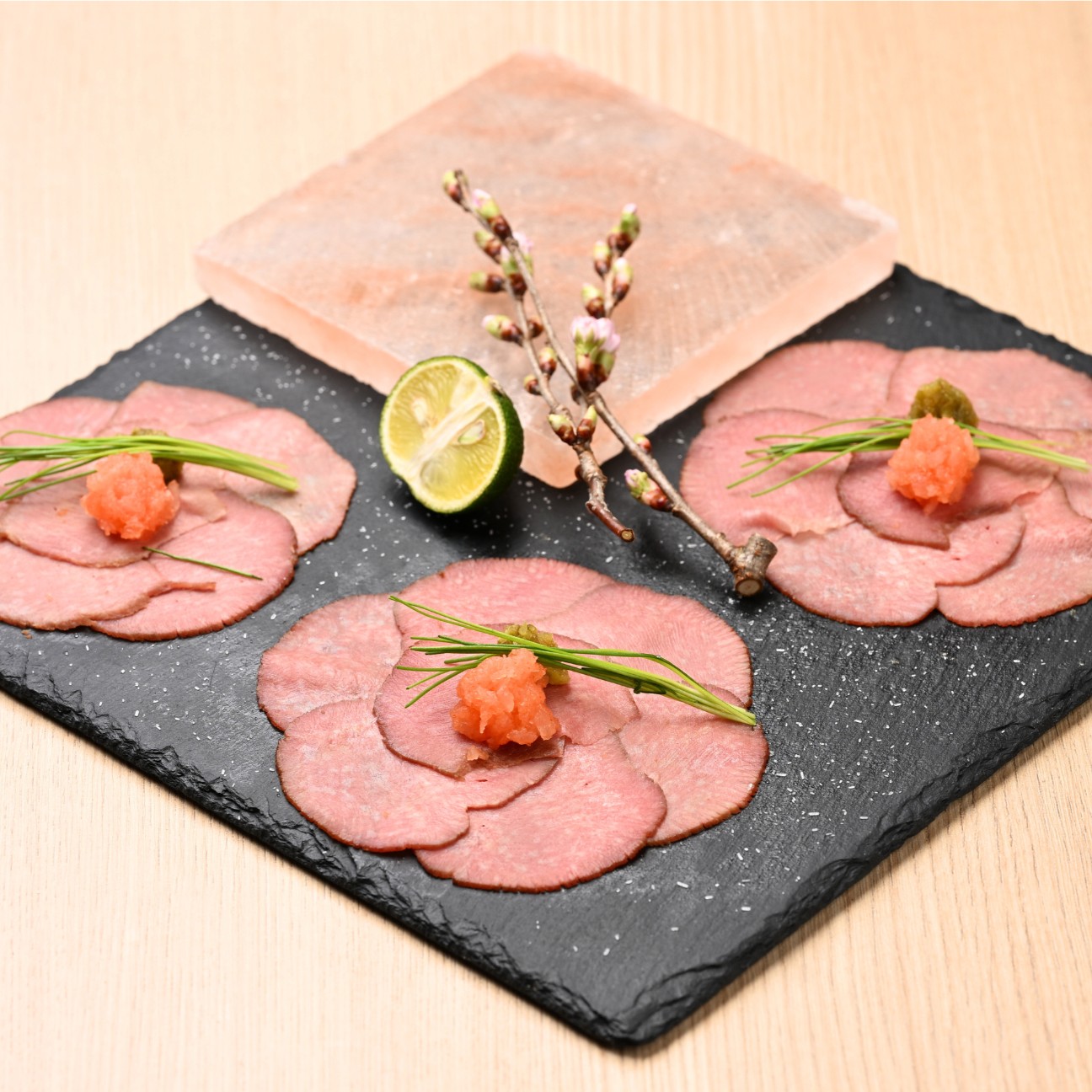 12時間低温調理でしっとりと仕上げた牛たんを、花のように美しく盛り付けた一皿。