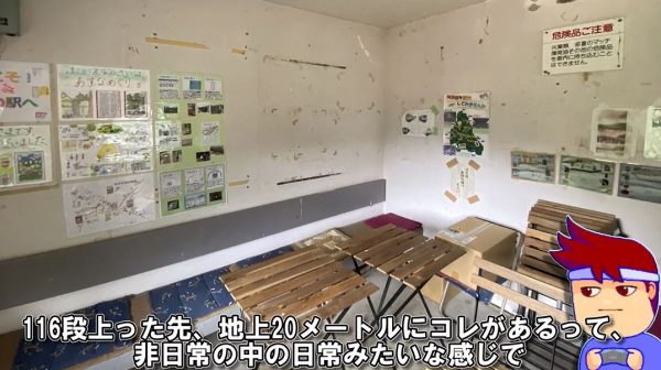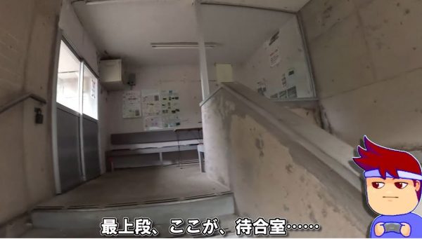 ホームに出られないのは心残りですが、ウスイさんはこの待合室の雰囲気が気に入ったよう。地元感がいいそうです。116段を登った先の地上20メートルにこれがあるのが、非日常の中の日常と感じたとか。
