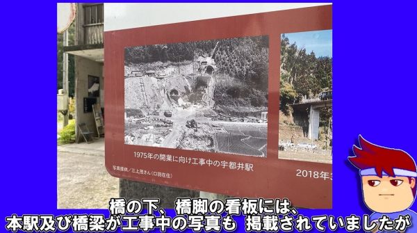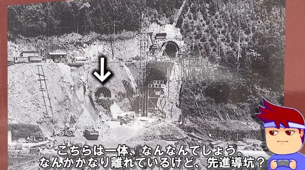 その後、橋の下の看板に見つけた写真です。工事中の様子なのですが、軌道用のトンネルの左下になぞのトンネルがあります。