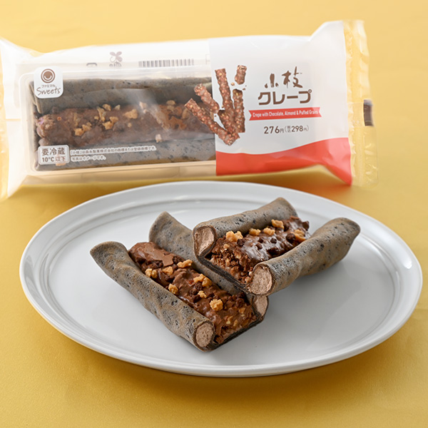 【内容】「小枝」をイメージしたクレープです。もちもち食感のクレープ生地に、チョコクリーム、クランチ、「小枝」をイメージしたチョコ掛けアーモンドパフをトッピングしました。