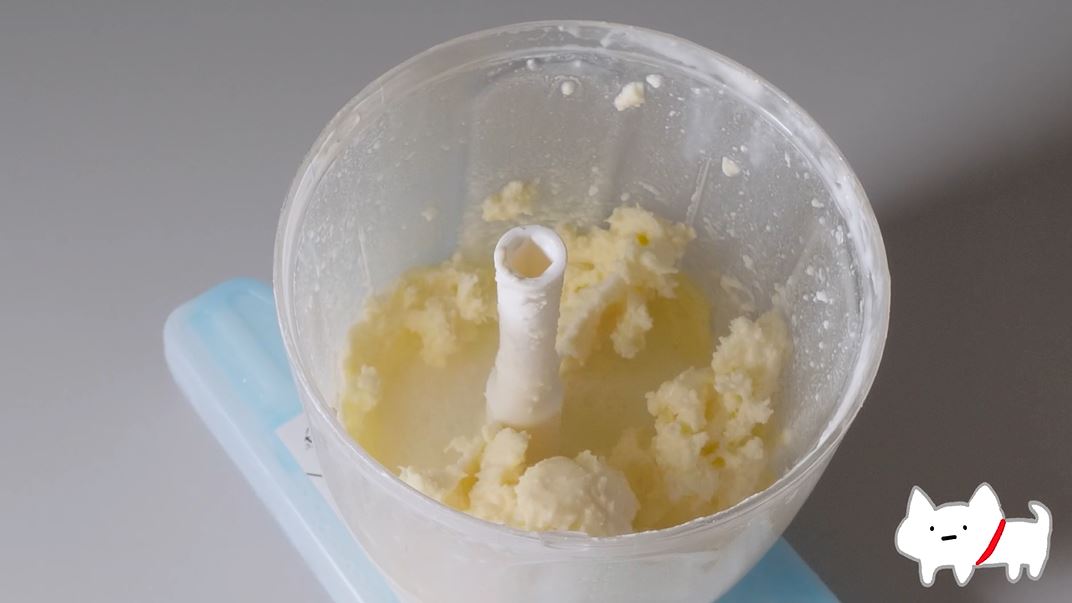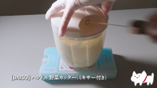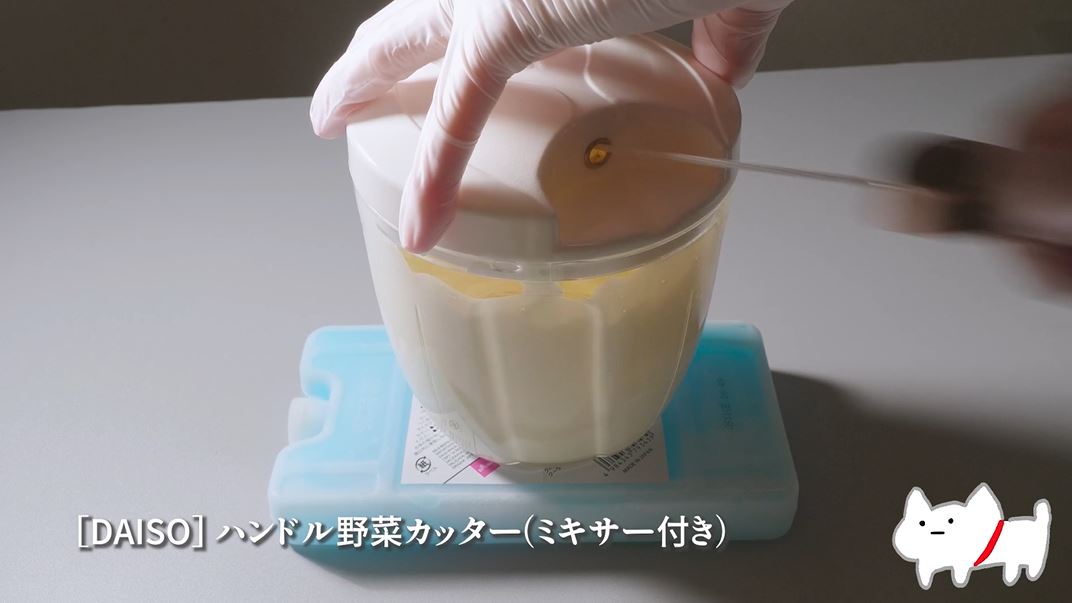 ダイソーで購入したハンドル野菜カッターに生クリームを入れると、何度も紐を引っ張り始めました。