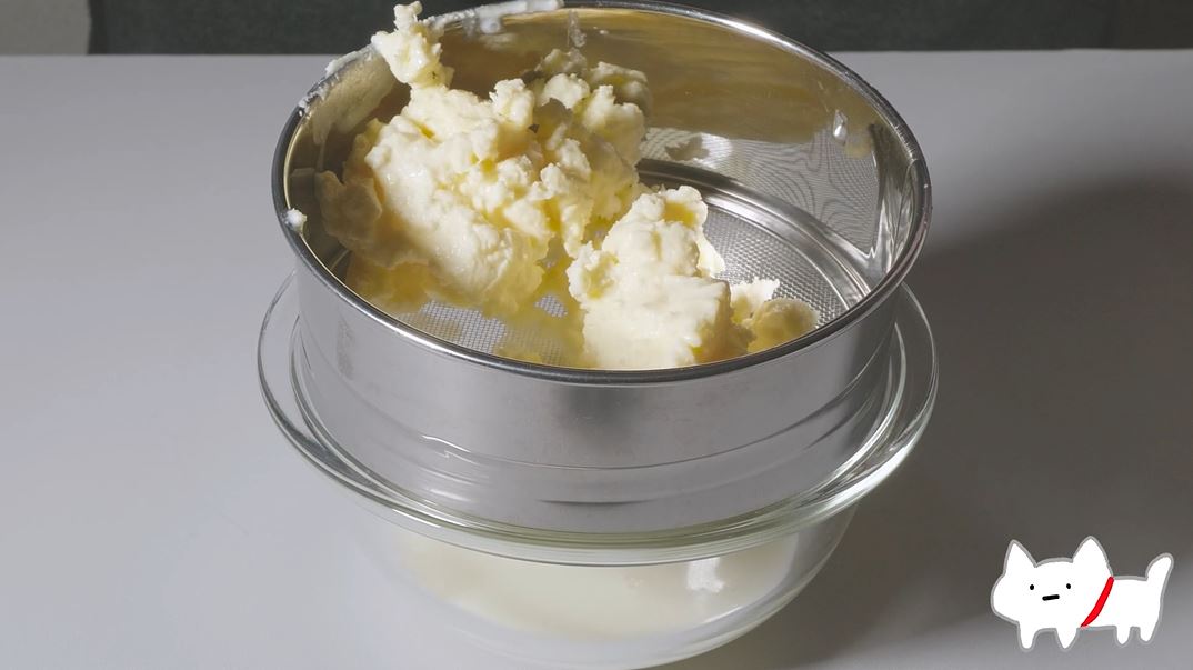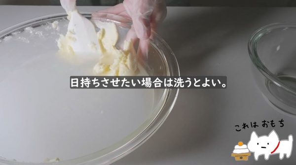 バターミルクという水分を除いたら、日持ちさせたい場合は洗います。こうしてとても綺麗なバターができました。