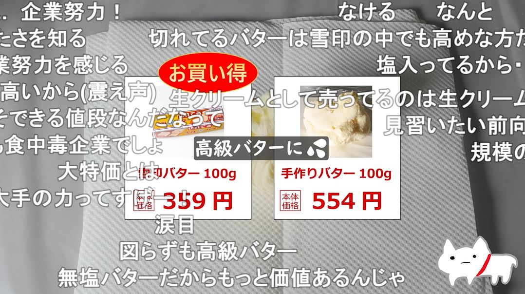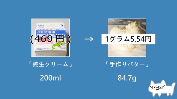 手作りバターを100gに換算すると554円なので、「図らずも高級バターを作ってしまった」とロウアイキューさん。