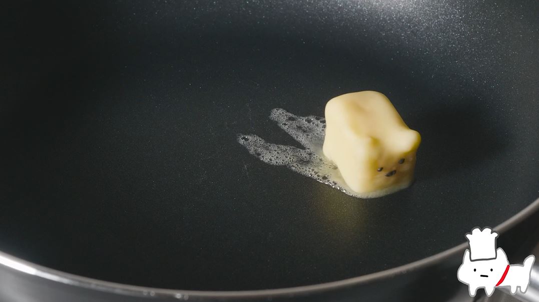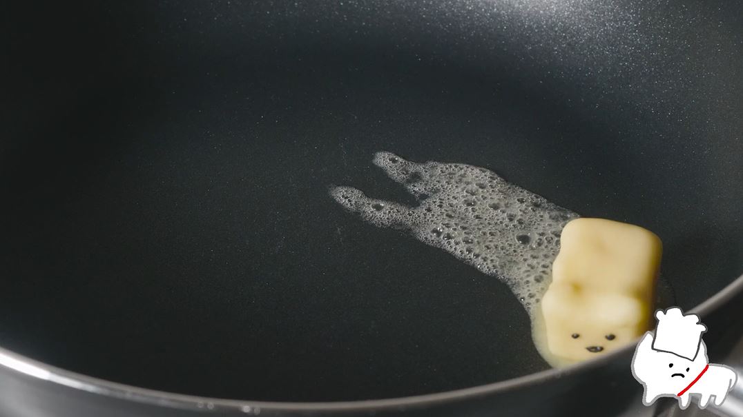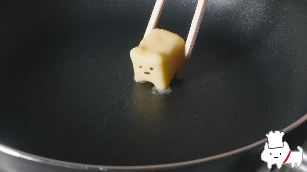 次はパンケーキ作りです。まずはフライパンにネコバターを乗せます。