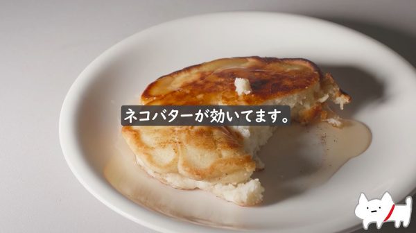 シロップもたっぷりかけてできあがり! 食べたロウアイキューさんは、「おいしい」に加えて「ネコバターが効いています」とコメント。