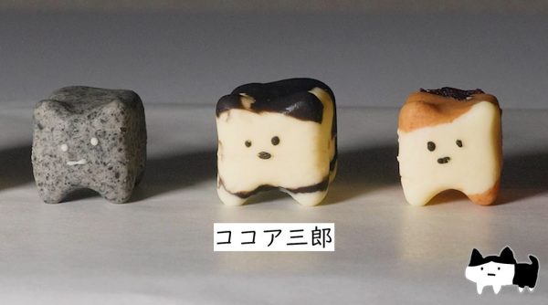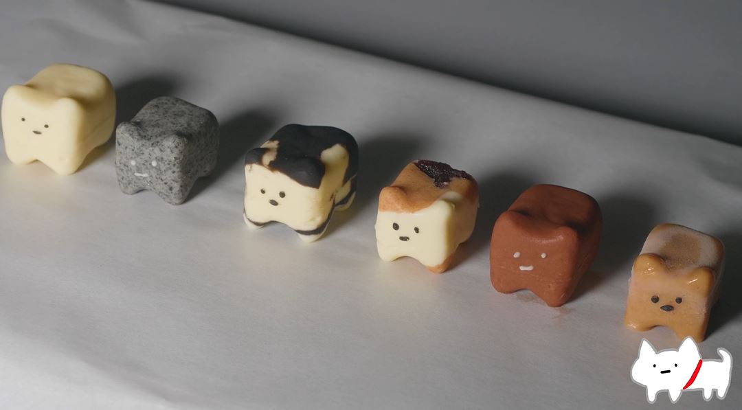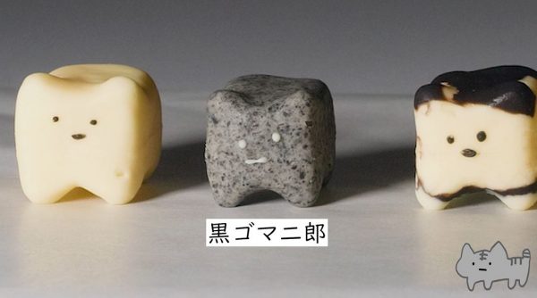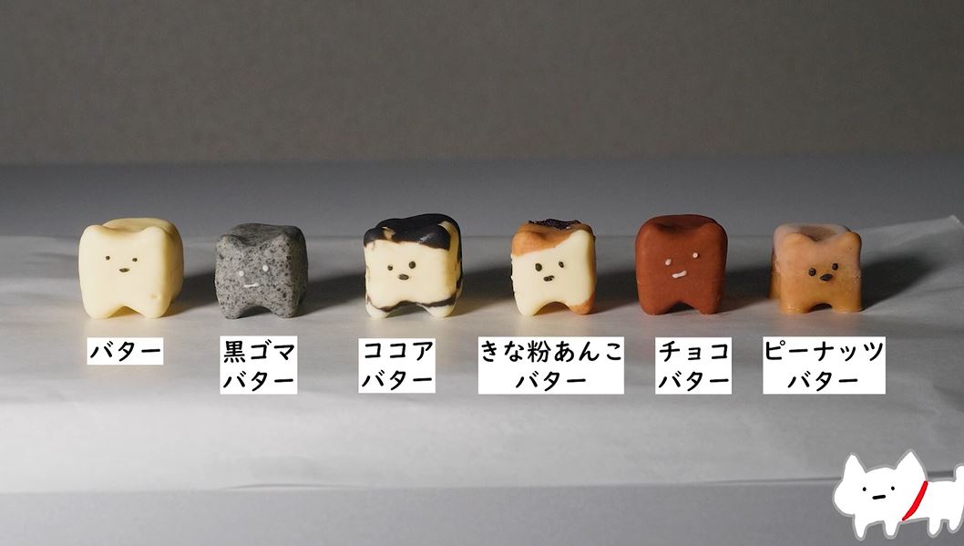 ノーマルの白猫の隣は黒ゴマのサバトラ、ハチワレはココア、三毛猫はきな粉とあんこ、という風に材料を変えて作ったのだとか。