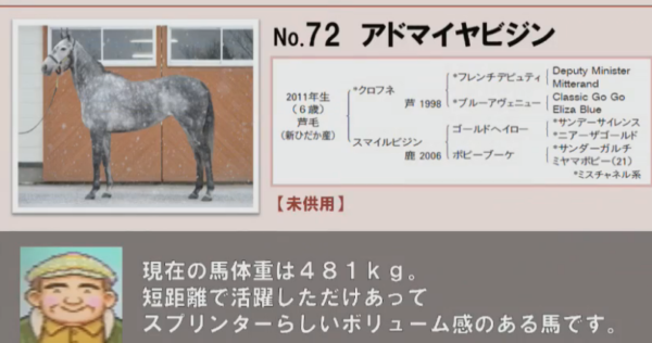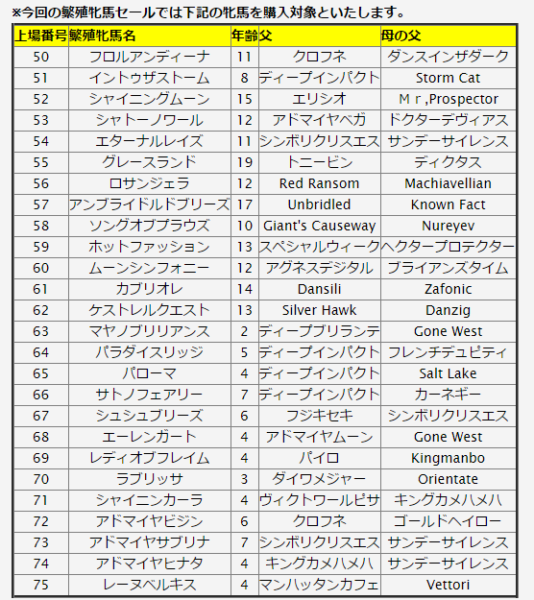 繁殖牝馬のセリは2月1日に北海道市場で開催される。おなかに赤ちゃんがいない全25頭の中からユーザーの投票で得票率上位の5頭を選び、その5頭の中から予算の範囲内で購入できる1頭をセリで購入する。セリは上場番号順で進んでいくので、1頭に決めてしまうと後半の馬が買えなくなる可能性があるためだ。