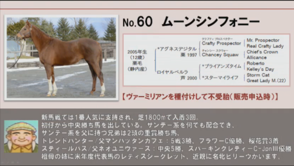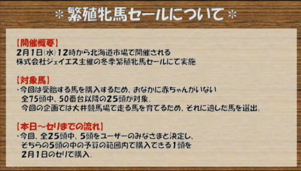 1月18日の第1回目の放送では、まず母馬となる「繁殖牝馬(はんしょくひんば)」を手に入れるべく、2月に北海道で開かれるセリに向けた準備を行った。セリの上場リストに記された25頭の中から、ニコニコユーザーみんなのリアルタイム投票で購入する繁殖牝馬を決定。果たしてどの馬が選ばれるのだろうか?